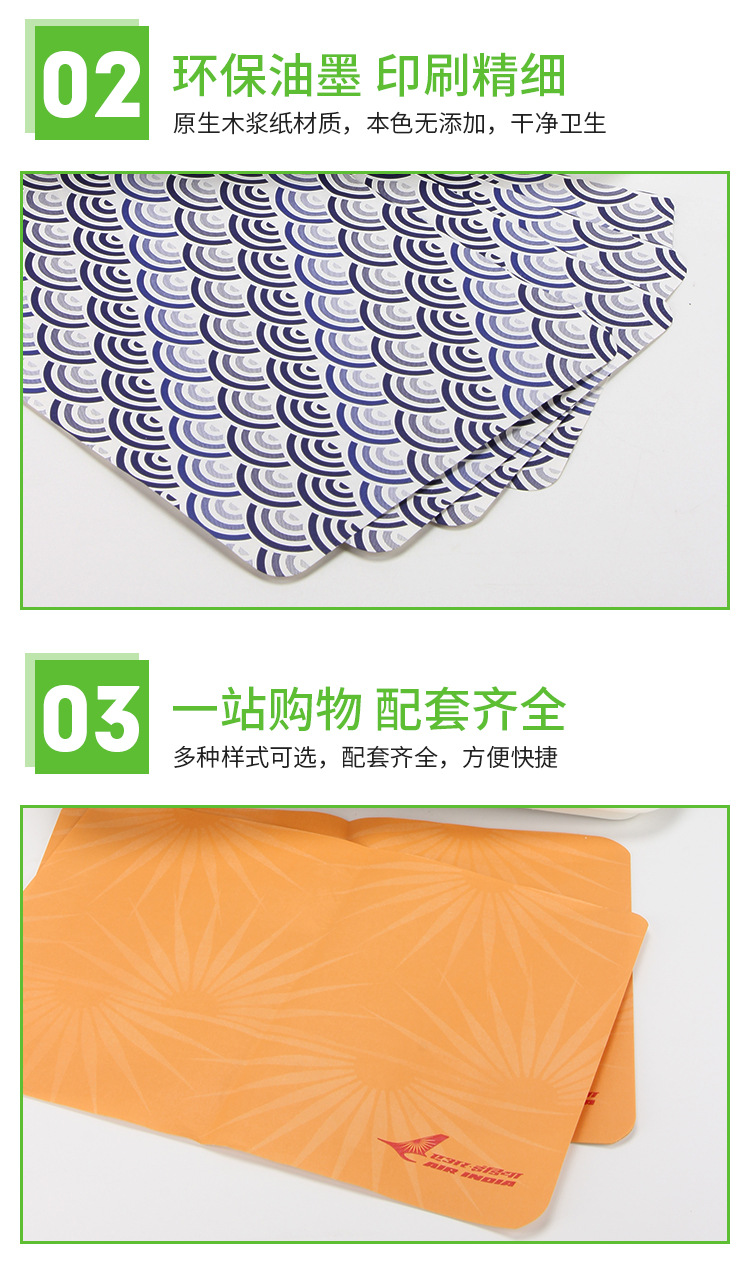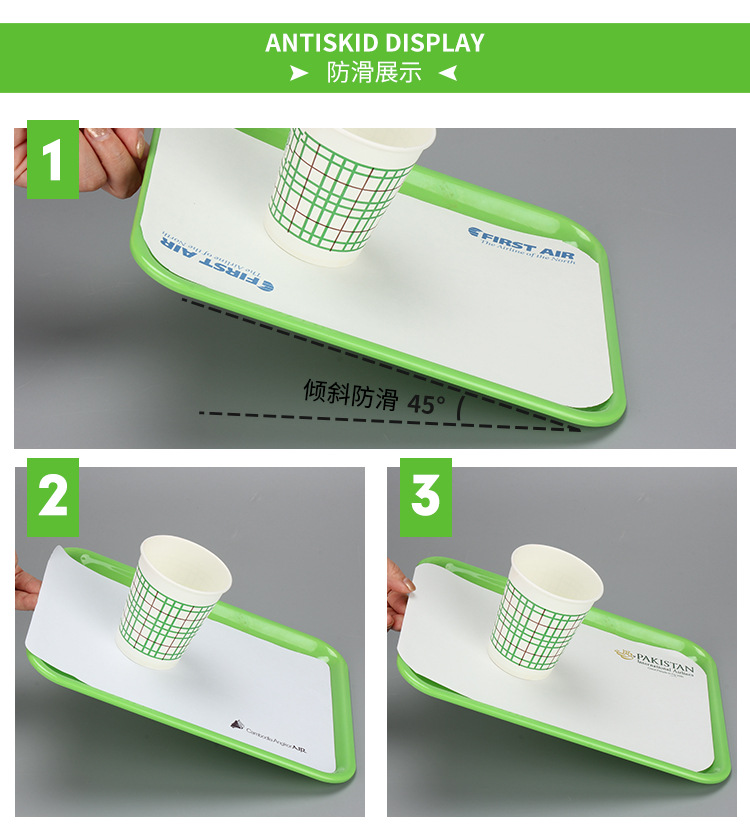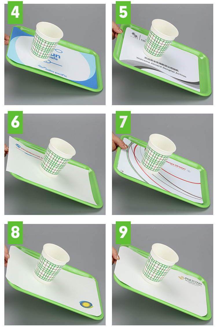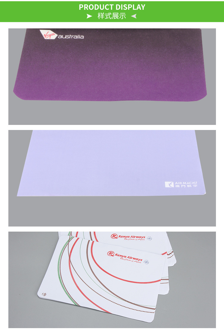航空トレイ滑り止め紙、トレイマット、コースター、環境に優しい水性インク使用、4色フレキソ印刷、特殊滑り止め剤配合、滑り止め効果は45度に達し、乗客のカップや食べ物の落下を防ぎます。さまざまな仕様、サイズ、印刷色は通常、角が丸いフルフォーマットで印刷されます。