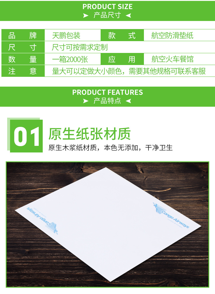 航空用滑り止め紙は、Lixiang Packaging が産業用パレットコンパートメントの滑り止めマットに使用するために開発した特殊な紙です。航空業界では、テーブルとトレイの間に置くことができ、航空用滑り止め紙は滑り止めの役割を果たし、トレイ内の乗客のカップや食べ物の落下を防ぎ、トレイが滑ったり落ちたりするのを防ぎます。飛行中は地面に置かれるため、トレイや食器は常にきれいで美しく保たれ、航空用滑り止め紙は飛行中に乗客のカップや食器が損傷する可能性を防ぎます。